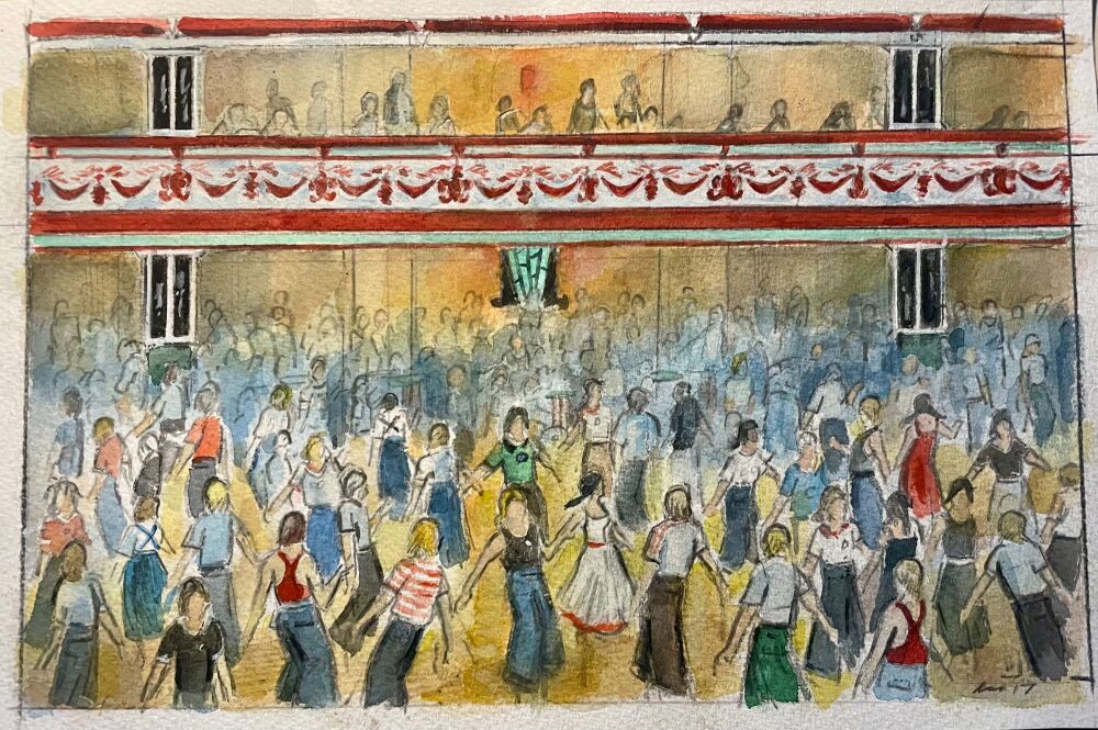 "Wigan Casino, 1973" - An original water colour painting of the packed dance floor at the Casino. 28 cm by 18 cm.